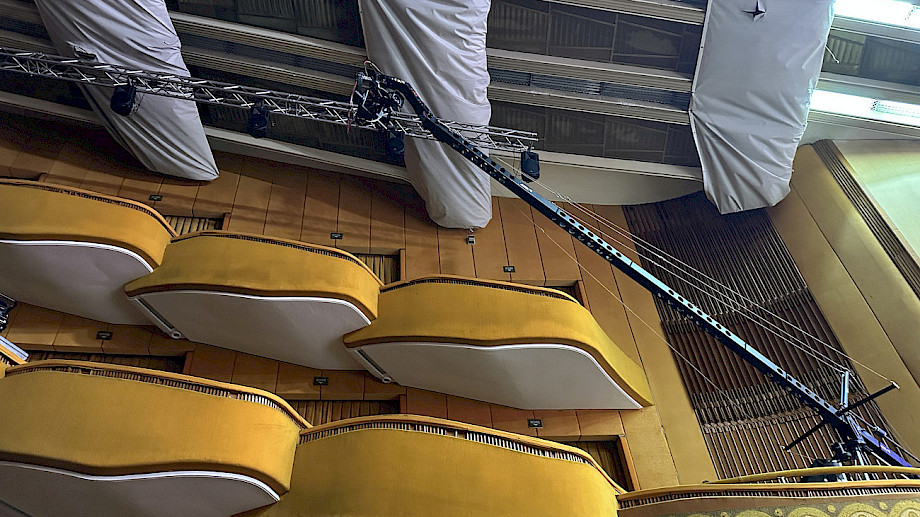 A huge swivelling camera arm was used for the live broadcast. It was stationed on one of the balconies on the left-hand side. During Enescu's prelude to the opera "Œdipe" on the first concert evening, the large cameras - there were also some on stage - were still noticeable, but after that they were soon forgotten.