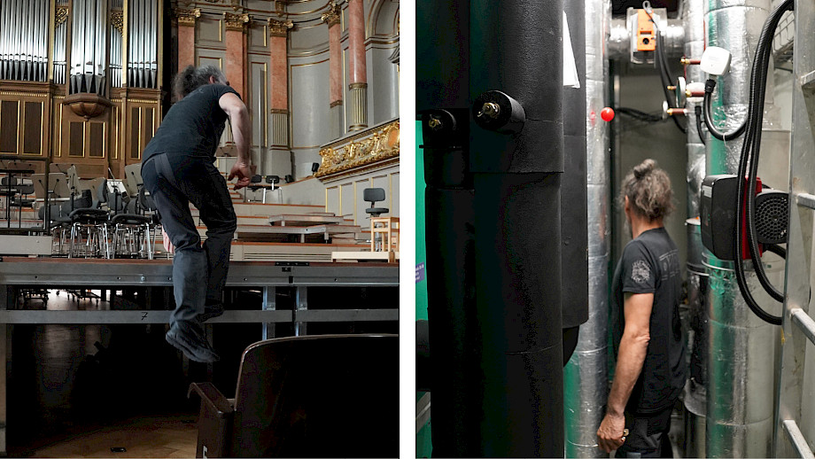 07:54 Kontrollgang durch das Dach-Labyrinth zwischen Bühnenmaschinerie, Kronleuchter-Aufhängung und Lüftung. Man muss schmal sein hier, die Durchgänge sind eng.