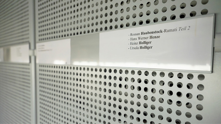 Etliche Laufmeter Compactus-Schränke reihen sich aneinander: Berio, Boulez, Dutilleux, Gubaidulina, Henze, Honegger, Leibowitz, Liebermann, Ligeti, Pagh-Paan, Reich, Rihm, Sacher, Ullmann, Ustvolskaya, Varèse, Webern – und viele mehr. Florian Besthorn zieht vorsichtig einige Schätze von den Ablagen und hantiert mit übergrossen Formaten von Partituren, während Paavo Järvi schon eingetaucht ist in die farbigen Eintragungen Sachers und anderer Dirigenten. «Aber was wünschte sich denn nun jemand wie Paul Sacher, der so vieles hatte, zum Geburtstag?», fragen wir uns. «Wir stehen mittendrin», sagt Besthorn. «Zu seinem 90. Geburtstag gab es das hier! Paul Sacher hat sich mit einem zusätzlichen Kulturgüterschutzraum beschenkt.» In einigen Regalen ist sogar noch Platz – für Zukünftiges.