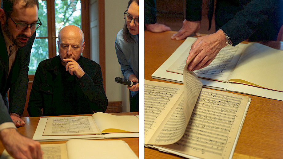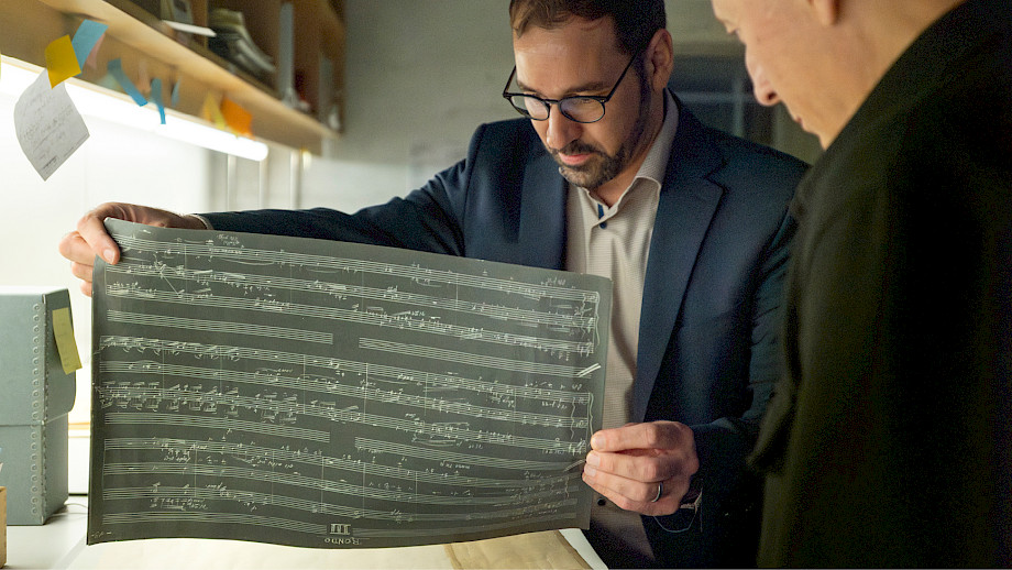 Auf dem Weg in Richtung Keller, wo «ein besonderes Geburtstagsgeschenk Paul Sachers auf uns wartet», deutet Besthorn auf Kisten mit neu eingetroffenem Material, die sich stapeln: «Hier sammelt sich schon einiges an. Und es braucht Zeit, alle Neueingänge zu sichten und angemessen einzupflegen.» Paavo Järvi hat sich gewünscht, noch einige Originalpartituren mit den Eintragungen von Komponist*innen und Interpret*innen zu sehen. Deswegen sind wir jetzt im untersten Geschoss angelangt. «Gleich wird es kalt!», warnt uns Besthorn vor. Dann betreten wir den klimatisierten Kulturgüterschutzraum.