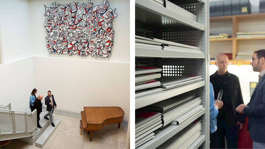 Wenn ein Teil der Geschichte zu Ende ist, fängt der andere Teil erst an: jener der Pflege eines Erbes, des möglichst freien Zugangs zu Quellenmaterial für Forschungszwecke aller Art. 1973 wurde die Paul Sacher Stiftung gegründet, zunächst mit dem Ziel, Sachers Musikalienbibliothek zu bewahren. Später wurde der Bestand zunehmend erweitert – und zwar systematisch: Vorhandenes wurde durch gezielte Ankäufe möglichst komplettiert, neue Schwerpunkte kamen hinzu. «Zur Eröffnung der Stiftung waren etwa 50 % der Sammlungen ‹schweizerische› Sammlungen. Dann wurde es aber bereits zu Sachers Lebzeiten stetig internationaler. Derzeit sind noch rund 20 % inländisch, wobei auch viele andere Sammlungen deutliche ‹schweizerische› Züge tragen, durch Aufenthalte zum Komponieren, die Zusammenarbeit mit dem Basler Kammerorchester und anderen Orchestern anlässlich Uraufführungen et cetera», erklärt Florian Besthorn auf dem Rundgang durch das Gebäude. Heute umfasst der Bestand über 120 Sammlungen von Komponist*innen sowie Interpret*innen des 20. und 21. Jahrhunderts. Das macht die Stiftung zu einem der international bedeutendsten Forschungszentren für Zeitgenössisches und die jüngere Vergangenheit.