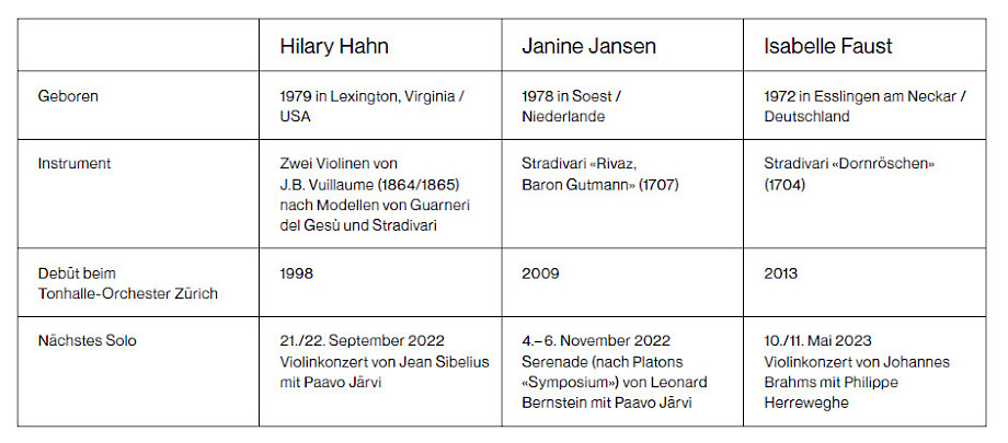 Hilary Hahn, Janine Jansen, Isabelle Faust: Three great violinists are our guests this season.