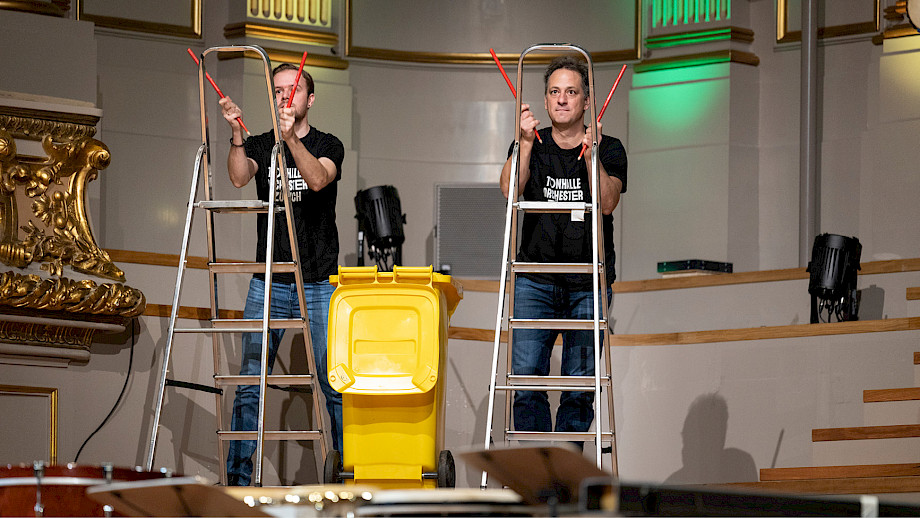 Zu erleben gab es nach einer Djembe-Session eine musikalische Weltreise, ein klangliches Riesenabenteuer, mit im Flugzeug die Schlagzeuger und weitere Musiker des Orchesters, zudem jede Menge Perkussionsmaterial im Gepäck: Kuhglocken und Leitern, auch ein Mülleimer, halt was man so braucht. Und ja, Rasseln bestehend aus Zehennägeln von Eseln. Kein Wunder, dass die kleinen Besucher*innen am Ende des Spektakels Schlange standen für Autogramme, die Martin Grubinger gerne verteilte.