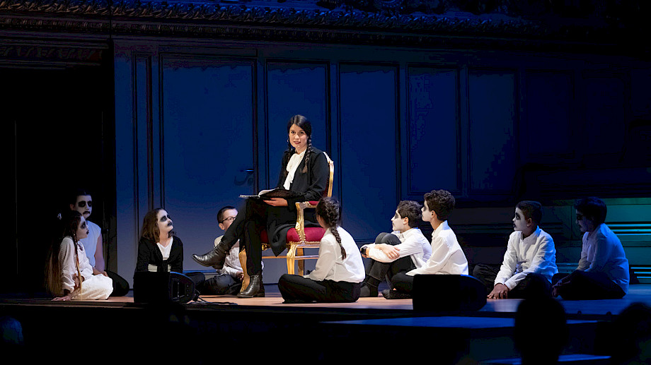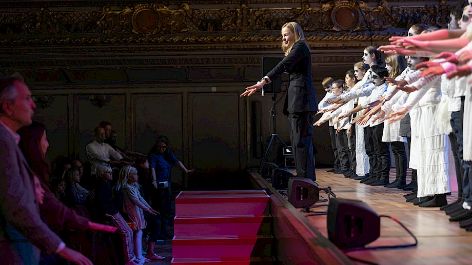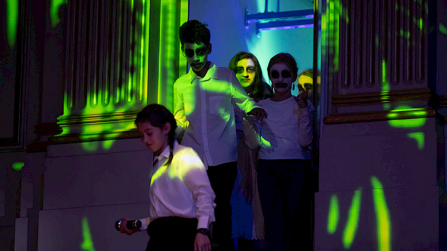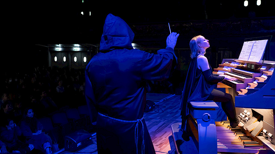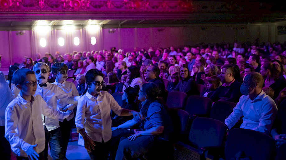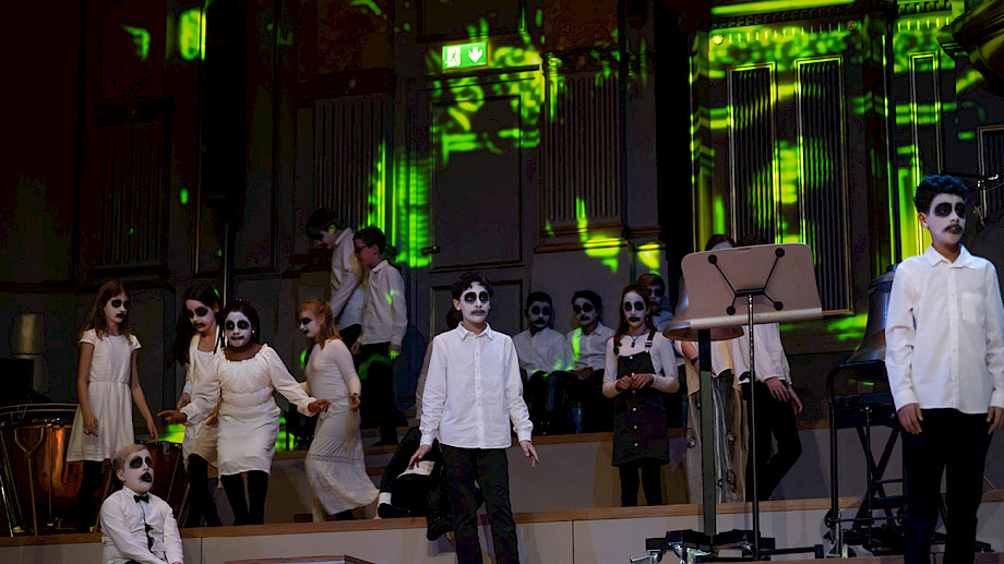 Daniela Timokhine Orgel, Konzept, Andreas Berger Perkussion, Klaus Schwärzler Perkussion, Chöre der Singschule MKZ Glattal, Dorien Wijn Einstudierung, Regie, Giorgina Hämmerli Erzählerin, Regie, Projektil Visuals Halloween-Konzertspuk