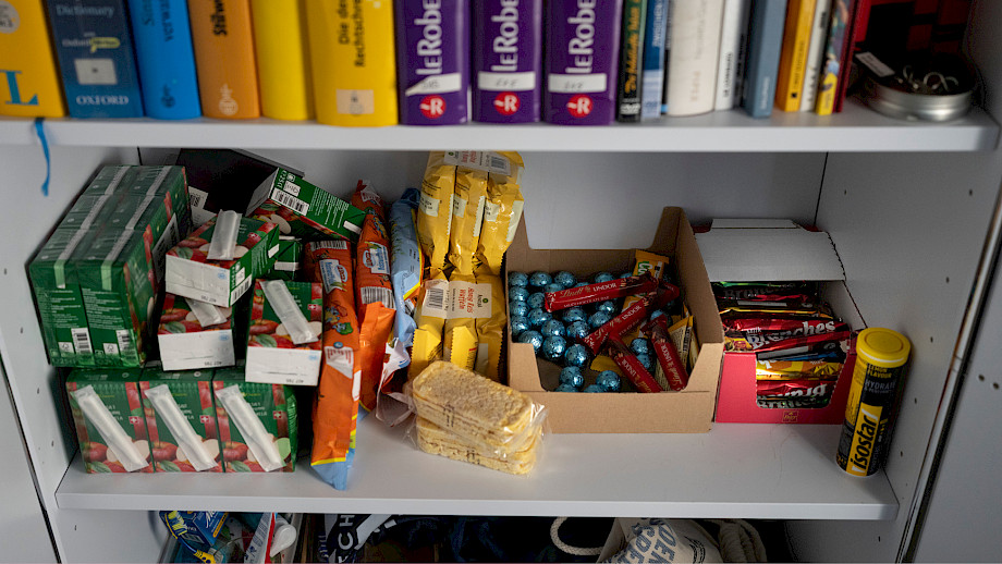 Manchmal braucht es dann etwas Schnelles für Zwischendurch, einen Energieschub, bevor es von der Schule in das Training geht oder das Angebot der Schulmensa nicht so überzeugt. Auch da ist Frau Meili die Anlaufstelle, denn in ihrem Einzelbüro gibt es einen «Fressschrank», wie sie diesen informellen Treffpunkt nennt. Er ist gefüllt mit Honig-Reis-Waffeln, Schoggistängeli, Vollkorn- Crackern und Eistee. Hier dürfen sich Schüler*innen bedienen, während sich Frau Meili noch mit ihnen kurz darüber austauscht, wie der Wettkampf in Ägypten war – «Gratuliere!» –, wann das nächste Trainingslager ansteht und ob eine Schulprüfung verschoben und nachgeholt werden muss. «Hier gibt es die coolen Begegnungen», meint Frau Meili zu den Augenblicken zwischen Tür und Angel. Und wie ist es über die Zeit gesehen? «Also die Maturfeier ist immer ein besonderer Moment. Du hast sie fünf Jahre begleitet, wir kennen uns gut und dann verabschiedet man sie. Wir haben dann zehn Tage Zeit, bis die Neuen kommen. Es ist immer ein Loslassen.»