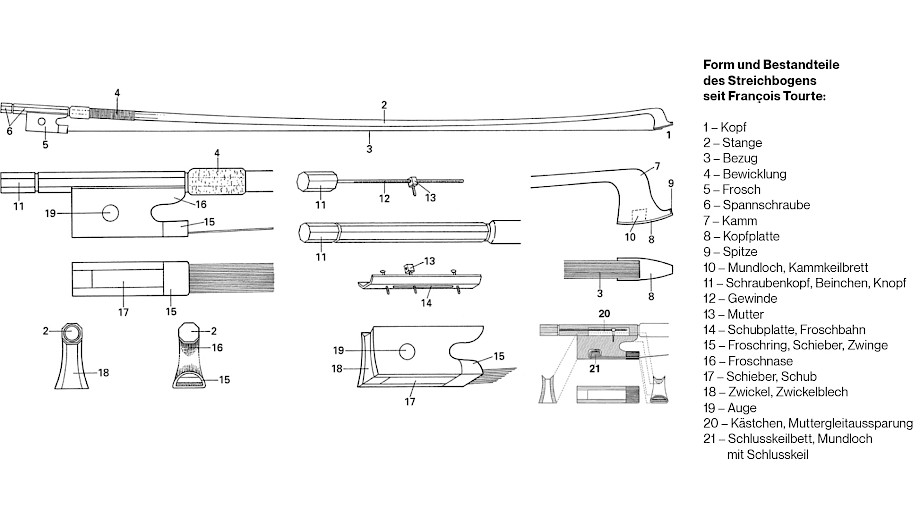So dokumentierte sein Schüler Jean-Baptiste Vuillaume (1798–1875), dass die Verjüngung des Querschnitts der Bogenstange mathematischen Gesetzmässigkeiten entspricht. Vor allem bietet der Bogen auf diese Weise eine enorme Elastizität. Der Frosch aus Ebenholz erhielt von Tourte ebenso seine heutige Form wie der Bezug aus Rosshaar – zuvor gebündelt, wird er seither als Band gleichmässig und breiter verteilt. Ausserdem erwiesen sich die Masse seiner Bögen, was die Gesamtlänge sowie die Abstände zwischen Bezug und Stange angeht, als optimal für die spieltechnischen Ansprüche. Entsprechend begehrt sind die Originale von Tourte, aber auch jene der französischen Schule um und nach Vuillaume: Peccatte, Simon, Lamy Père und Voirin sind klingende Namen, wenn es um Bögen geht.