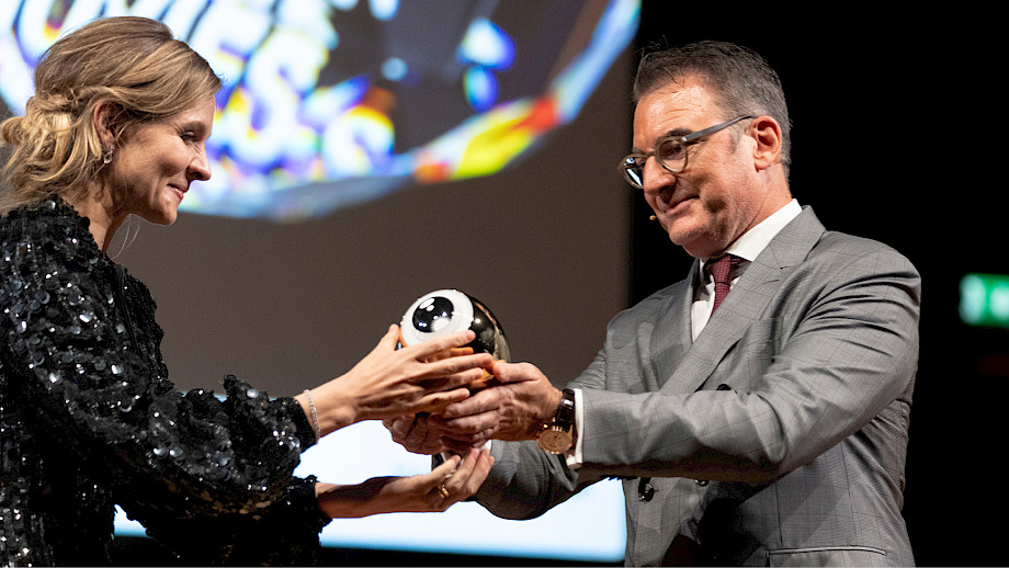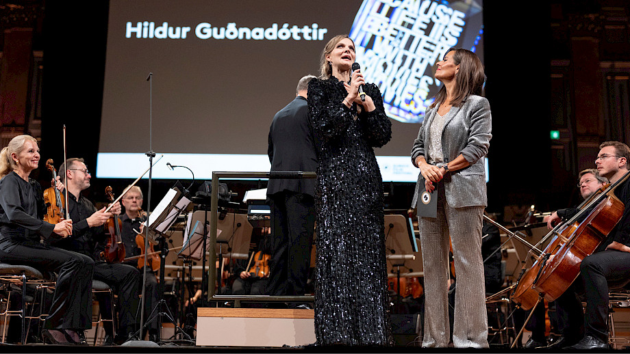 Christian Jungen überreicht Hildur Guðnadóttir das «Golden Eye». Foto: Gaëtan Bally