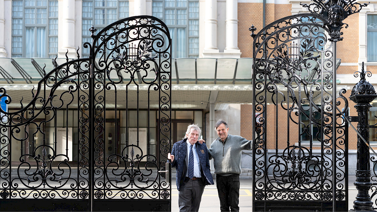 Da stehen die beiden, angelehnt an ein Stück Historie der Tonhalle Zürich: Moritz Häberling, Kunstschmied, und Charles Roulet, Erbe des Hotels Baur au Lac sowie Gastgeber des gleichnamigen Clubs. Sie strahlen, mit gutem Grund: Unter dem Tor, das nun vor dem Club steht, ging einst das Publikum durch, wenn es Konzerte in der Tonhalle besuchte.