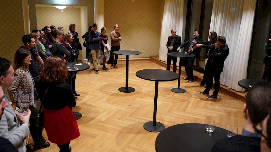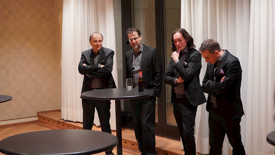Genauso energiegeladen wie im Konzert präsentierten sich die vier Pianisten auch im Meet & Greet mit dem klubZ. Es entstand sogleich ein kurzer, aber knackiger Austausch, in dem jeder der Künstler einen kleinen Einblick in seine Arrangier-Arbeit gab und vor allem reichlich aus dem Nähkästchen plauderte. So erfuhren die klubZ-Mitglieder zum Beispiel, wie es kam, dass Stefan Wirth bei einem früheren Konzert in der Tonhalle Zürich 30 Minuten vor Beginn plötzlich verschwand und dann mit Krücken auf die Bühne kam. Oder auch, inwiefern die experimentellen Saiten-Zupf-Einlagen Mensch und Instrument gleichermassen fordern. An diesem Konzert ist zum Glück alles gut gegangen.