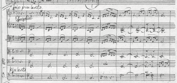 Ausschnitt aus der handschriftlichen Partitur der 9. Streichersinfonie Mendelssohns. Oben links zu sehen ist die vom Komponisten gewählte Bezeichnung «Schweizerlied» (doppelt unterstrichen).