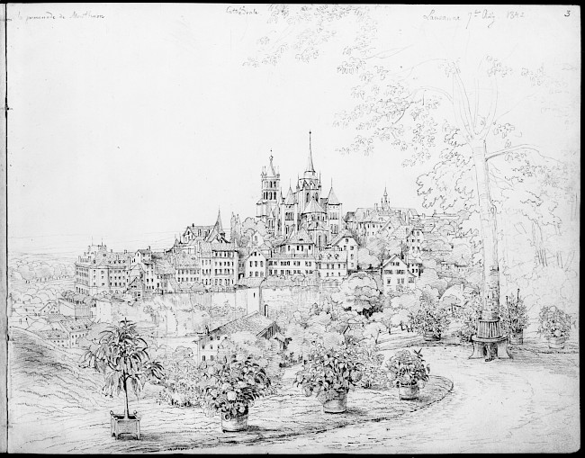Die Kathedrale und die Promenade Montbenon in Lausanne. Zeichnung, die Mendelssohn auf der Reise von 1842 anfertigte.