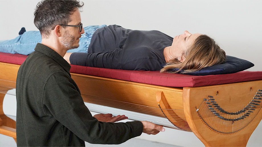 Das klingt einfach. Dass es das nicht ist, merkt die Besucherin bei einem kleinen Test auf der Klangliege in Christian Kloters Atelier. Es ist eine Art überdimensioniertes Monochord, unter dessen Liegefläche die Saiten verlaufen. Legt man sich drauf, spürt man die Vibrationen, wird eingehüllt von diesem Klang, lässt sich hineinziehen, fühlt sich geborgen – bis einem auffällt, dass das Instrument im Quintintervall gestimmt ist und das Obertonspektrum sich ständig verändert: Damit ist der Kopf wieder aktiv, der Klangraum bricht auf, die Wirkung verblasst. Auch sich auf eine Therapie einzulassen, ist Übungssache.