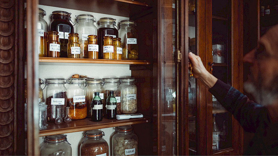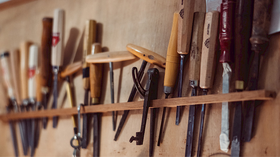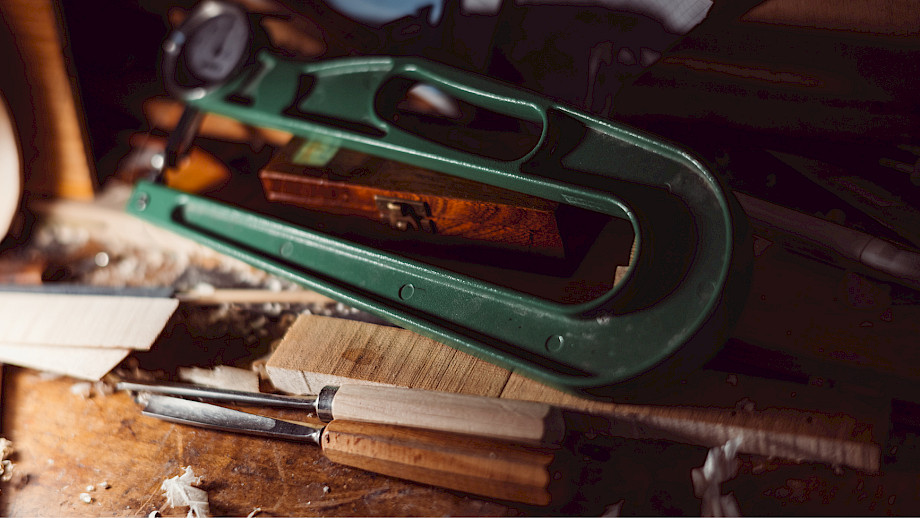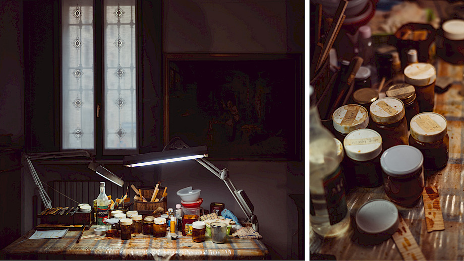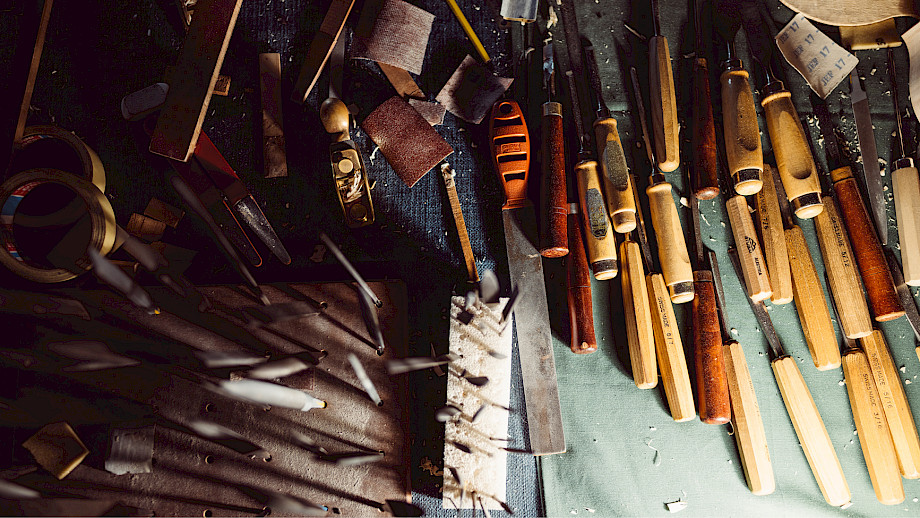 Ihre Werkstatt ist deutlich geräumiger als jene von Katharina Abbühl. Der Eingangsraum ist verziert mit Holzarbeiten des Vaters, der den Weg vom Baum bis zur Violine in Reliefs geschnitzt hat. Im hinteren Zimmer hängen ein paar Geigen an einer Leine, in einem Apothekerschrank sind Gläschen und Fläschchen mit Lacken und Harzen aufgereiht. Im Raum dazwischen steht der Arbeitstisch, eine Tischlampe sorgt für gedämpftes Licht – und Vincenzo Bissolotti muss ein paar Schalter ausprobieren, bis er jenen für die Deckenbeleuchtung findet, um uns zu zeigen, warum er diese nie einschaltet: «Man sieht nichts, wenn es zu hell ist, die Strukturen des Holzes sind gar nicht mehr zu erkennen.»